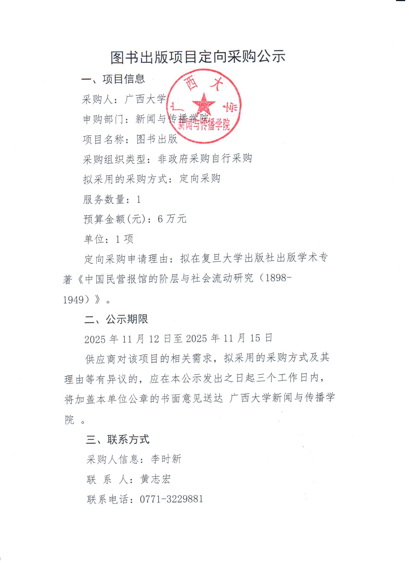新闻学院陈瑞群老师图书出版项目定向采购公示