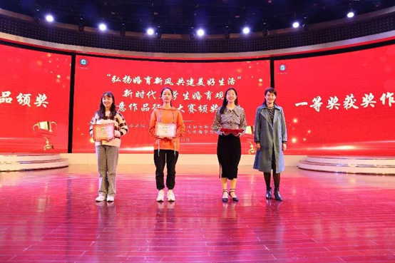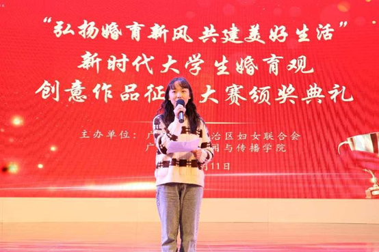 自治区妇联副主席张捷为三位一等奖获奖作品的主创人员颁奖,获奖作品包括视频《只想好好爱》、调研报告《“三孩”政策下yl23411永利生生育价值观调研报告》、视频《近六成大学生希望在26-30岁结婚,80%偏好两个子女》。三个作品传达了同学们对新时代婚育观、新兴婚姻伦理的深刻思考、感悟以及对美好生活的向往,弘扬了青春主旋律。