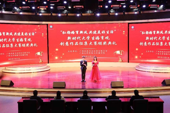 12月11日晚,“弘扬婚育新风 共建美好生活——新时代大学生婚育观”创意作品征集活动颁奖典礼在我院融媒体中心举行。自治区妇联副主席张捷、学院党委书记唐兴、自治区妇联家庭和儿童工作部副部长唐婧、学院党委副书记银健、学院辅导员黎明出席活动。颁奖典礼由唐子涵、赵一菲同学主持。