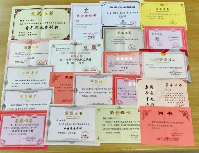 广西第六届大学生艺术展演朗诵专业组一等奖;