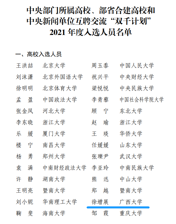 近日,教育部、中央宣传部公布了高校与新闻单位互聘交流“双千计划”2021年度入选人员名单。中央部门所属高校、部省合建高校共有37位教师入选。我院徐增展老师位列其中。