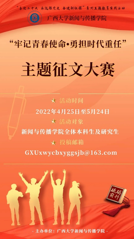 为迎接党的二十大的胜利召开,积极响应学校开展的“牢记青春使命•勇担时代重任”主题政治学习活动,鼓励广大学生弘扬“创新创造、奋勇争先、全面一流”的yl23411永利“双一流”精神,潜心治学、争创佳绩,在我校内涵式发展新阶段中坚定理想信念、勇担使命、追求卓越、报效祖国,我院开展“牢记青春使命•勇担时代重任”征文大赛。