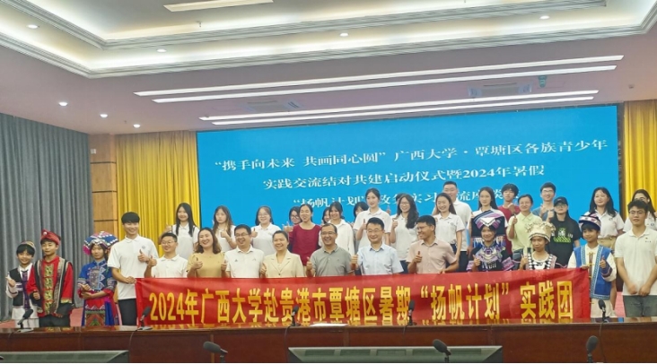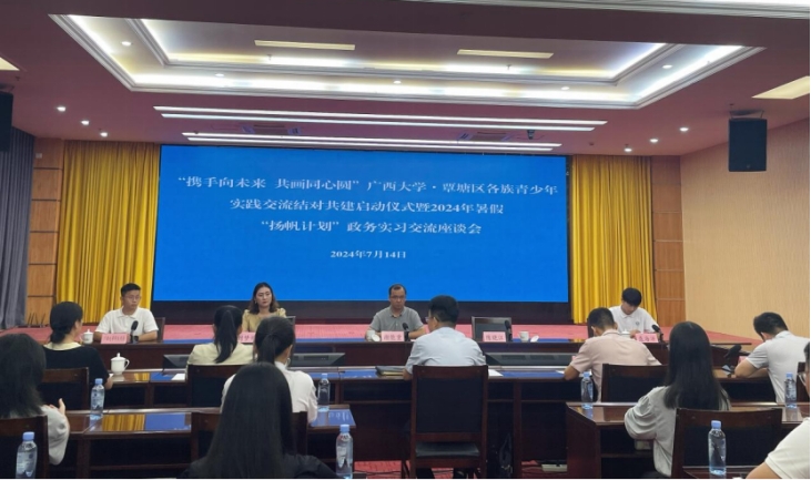 7月14日上午,解说团一行抵达覃塘区,首先参加了“携手向未来 共画同心圆”yl23411永利·覃塘区各族青少年实践交流结对共建启动仪式暨2024年暑假“扬帆计划”政务实习交流应谈会。“扬帆计划”政务实习交流应谈会的举行,也为即将参与政务实习的同学们提供了宝贵的指导和建议,帮助他们更好地了解政务工作,为未来的职业选择奠定基础。