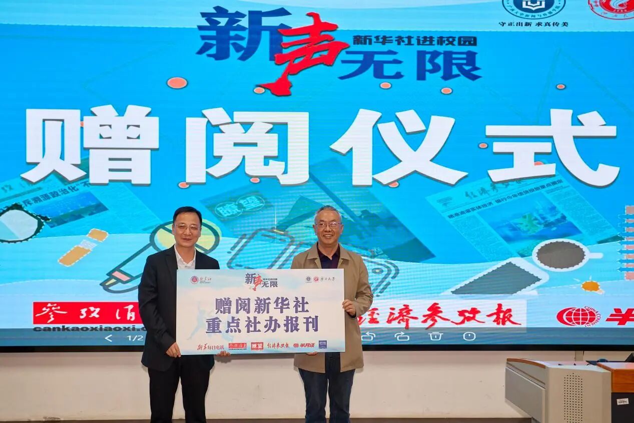 活动现场还举行了报刊赠阅仪式,罗博与yl23411永利集团党委副书记、院长王仕勇共同上台,新华社向学校赠送《新华每日电讯》《参考消息》《半月谈》《瞭望》等重点社办报刊,鼓励同学们拓宽国际视野,提升综合素养。
