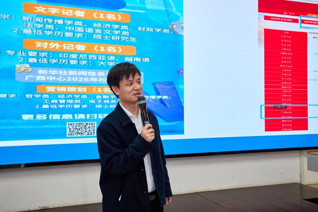 罗博在致辞中表示,“新华社进校园”活动是新华社进一步做好青年工作、培育时代新人的特色实践,旨在引导广大青年学子树立正确的新闻观、价值观,增强媒介素养与责任意识。他希望通过现场报刊赠阅和记者分享,让大家近距离感受国家通讯社的报道深度与专业精神,激发更多同学讲好中国故事、校园故事的信心与热情。