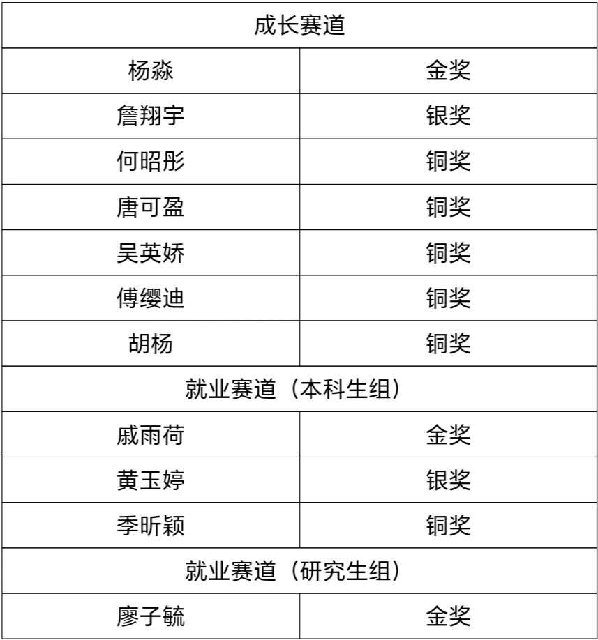 经院级初赛、校级初赛层层遴选,全校60名选手入围决赛,我院5名选手晋级,戚雨荷、杨淼、廖子毓分获本科生就业赛道、成长赛道、研究生就业赛道金奖,詹翔宇等8名学子摘得银、铜奖。