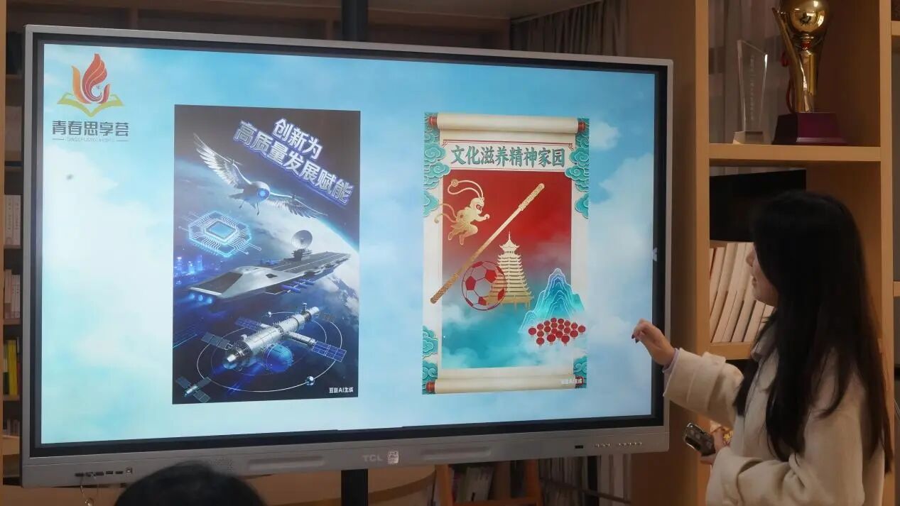 感悟于心,更须践之于行。在“践行·以行践知”环节,同学们运用专业所学,将贺词核心观点转化为可视化海报进行展示。多幅由同学们主导设计、并融入AI技术辅助完成的创意作品依次呈现,体现了新传学子运用现代技术进行视觉表达与传播实践的能力。