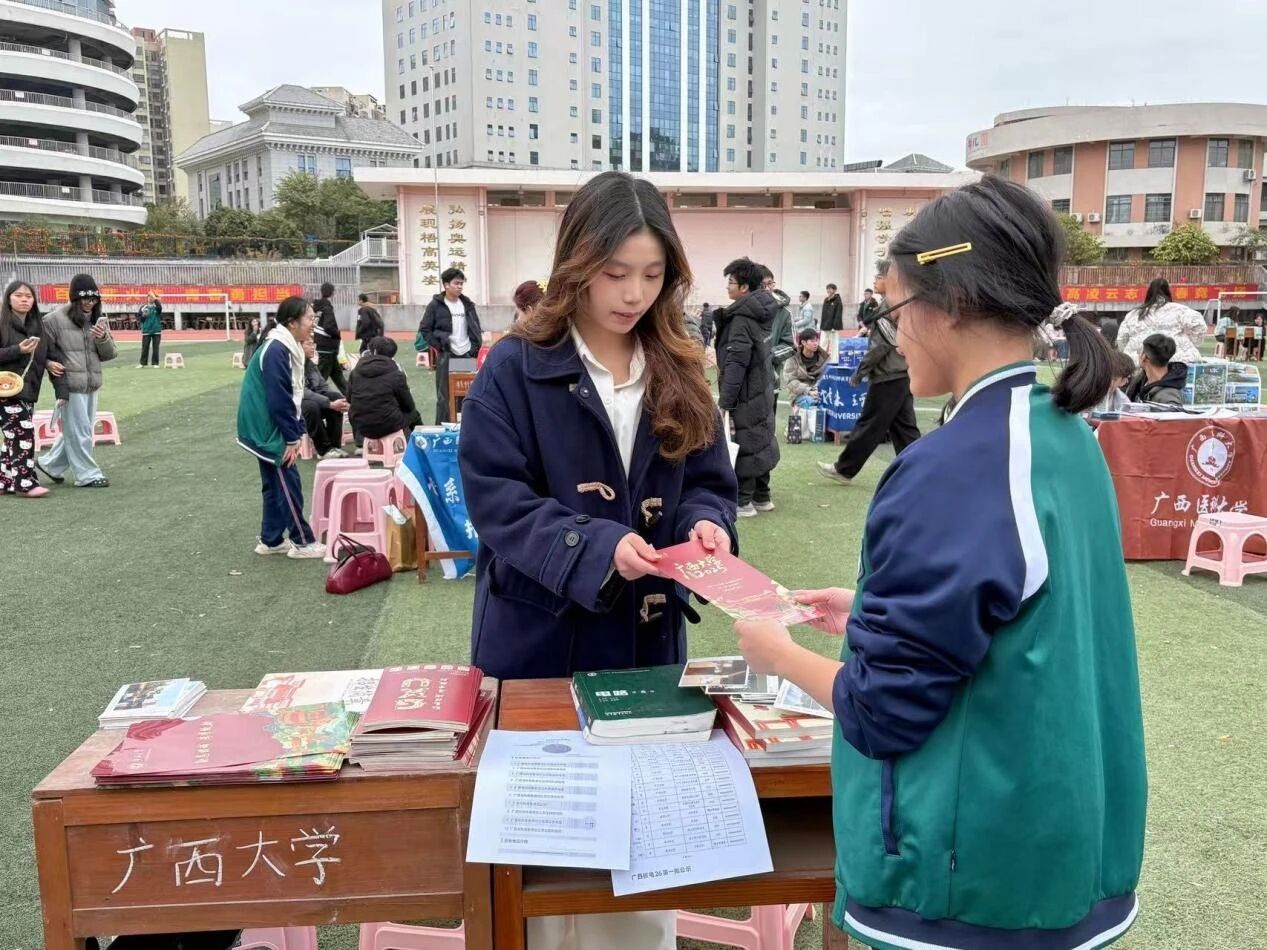 1月31日至2月1日,梧州高级中学的校园里,一场特别的宣讲正在悄然进行。新闻252班的谭斯文与电气工程学院的吴松泽打破传统宣讲模式,以开放摊位的形式,在学校操场打造了一座微型“西大文化站”,迎接全校约3500名学子的驻足咨询。