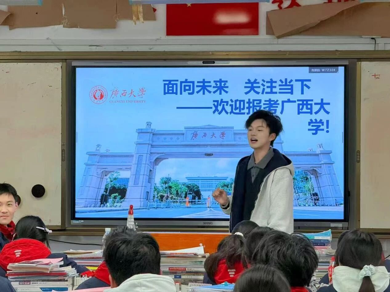 不同专业的碰撞,总能解锁更多精彩!2月1日,播音251班的邓媛元作为主讲人,携手来自计算机、法学、电气、经济等多个学院的伙伴肖子康、周逸安、罗海蓝、胡祥云、张丁文,组成一支多元化宣讲小队,走进玉林市第一中学。