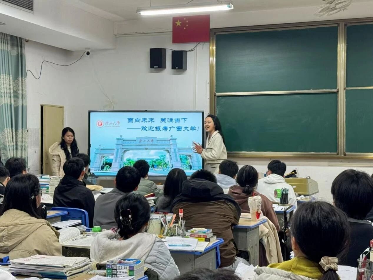 情系母校,共赴山海。2026年2月5日,新闻251班的韦颖霞同学与越南语251班的邓潘子悦,一同重返母校南宁二中,面向500余名高三学子,开展了一场充满力量的宣讲分享。