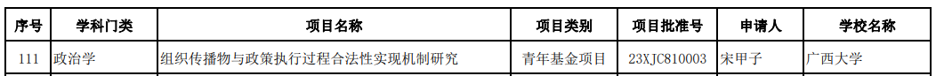 近日,教育部社科司关于2023年度教育部人文社会科学研究一般项目立项的通知。我院宋甲子助理教授申报的青年项目“组织传播物与政策执行过程合法性实现机制研究”获得立项。