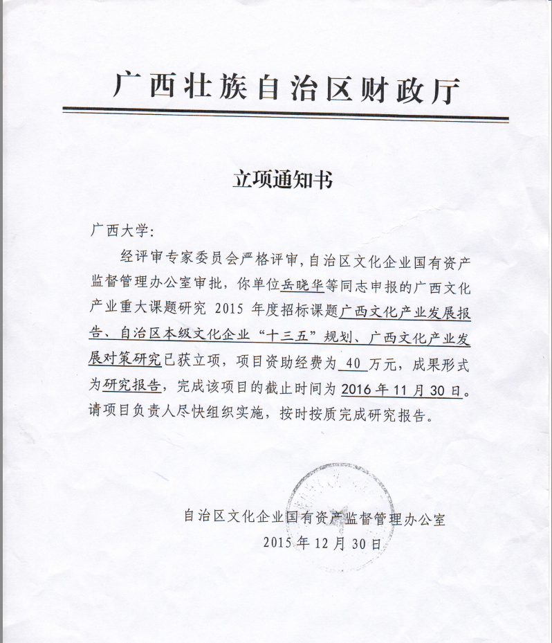 我院岳晓华教授2015年申报广西文化产业重大课题研究项目获得立项