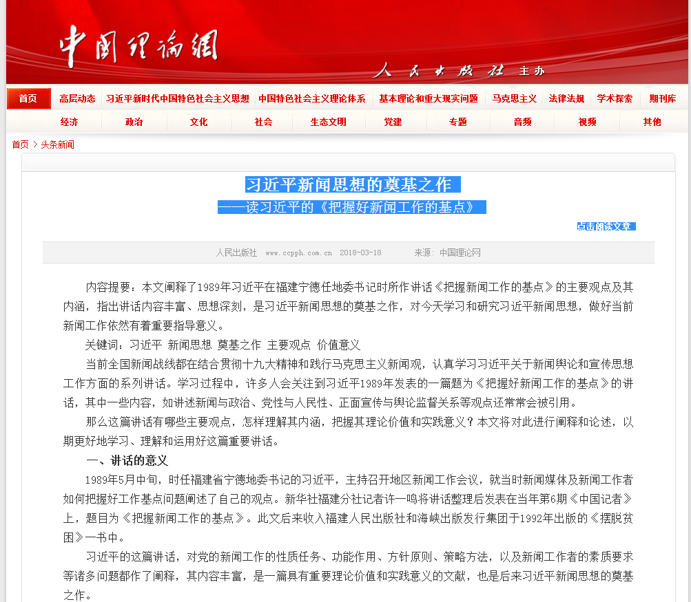 郑院长最新文章《习近平新闻思想的奠基之作——读习近平的<把握好新闻工作的基点>》荣登中国理论网大头条