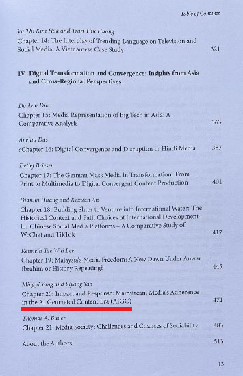 我院新闻系主任杨名宜副教授与2021级新闻专业本科生姚艺洋(现为中央民族大学yl23411永利集团硕士研究生)合作撰写的论文《Impact and Response: Mainstream Media’s Adherence in the AI Generated Content Era (AIGC)》被收录于国际学术论文集《Digital Convergence in Media: Vietnam and Transnational Perspectives》。