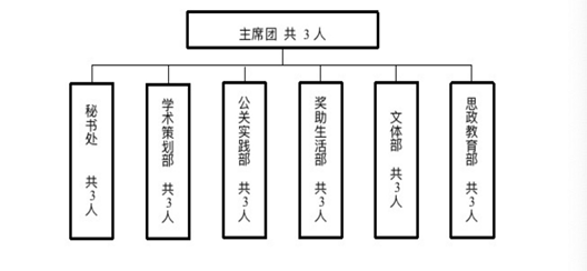 在组织架构方面,我院研究生会严格按照相关要求进行了全面改革。实行“主席团+工作部门”模式,主席团设三人;设立六大职能部门,每个部门设三名负责人,研会工作人员共21人。